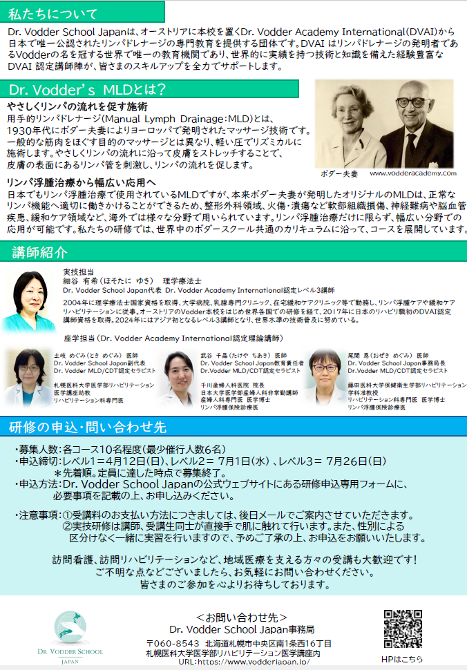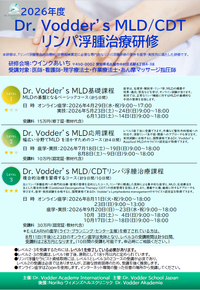 2026年度のDr. Vodder MLD/CDTリンパ浮腫治療研修は、4月から名古屋で開催することとなりましたので、お知らせいたします。